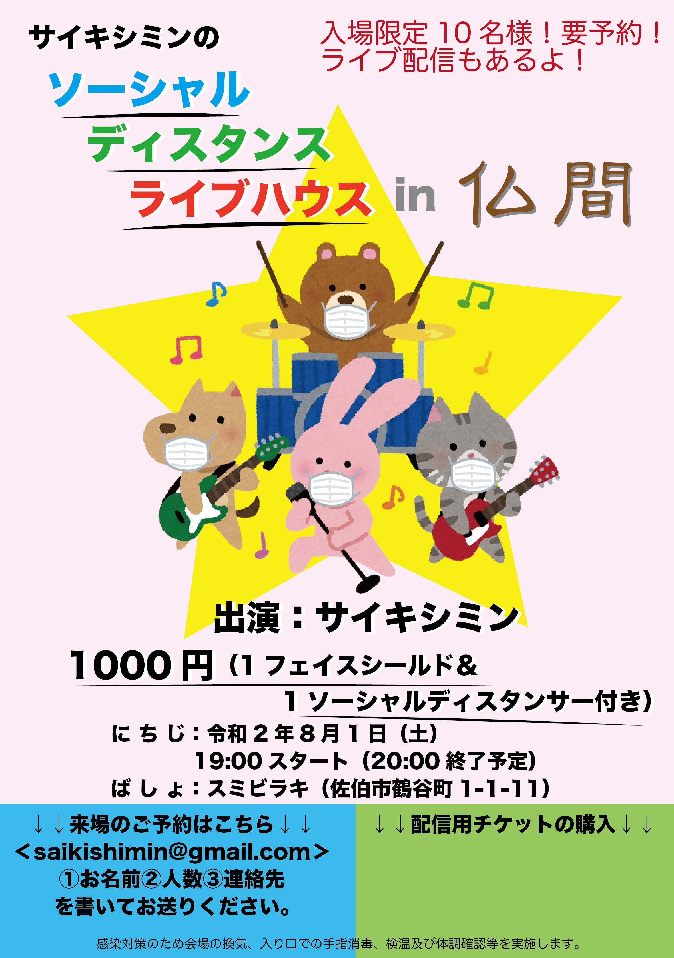 8/1(土)19:00から行われる「サイキシミンのソーシャルディスタンスライブハウスin仏間」の有料ライブ配信のチケットです。